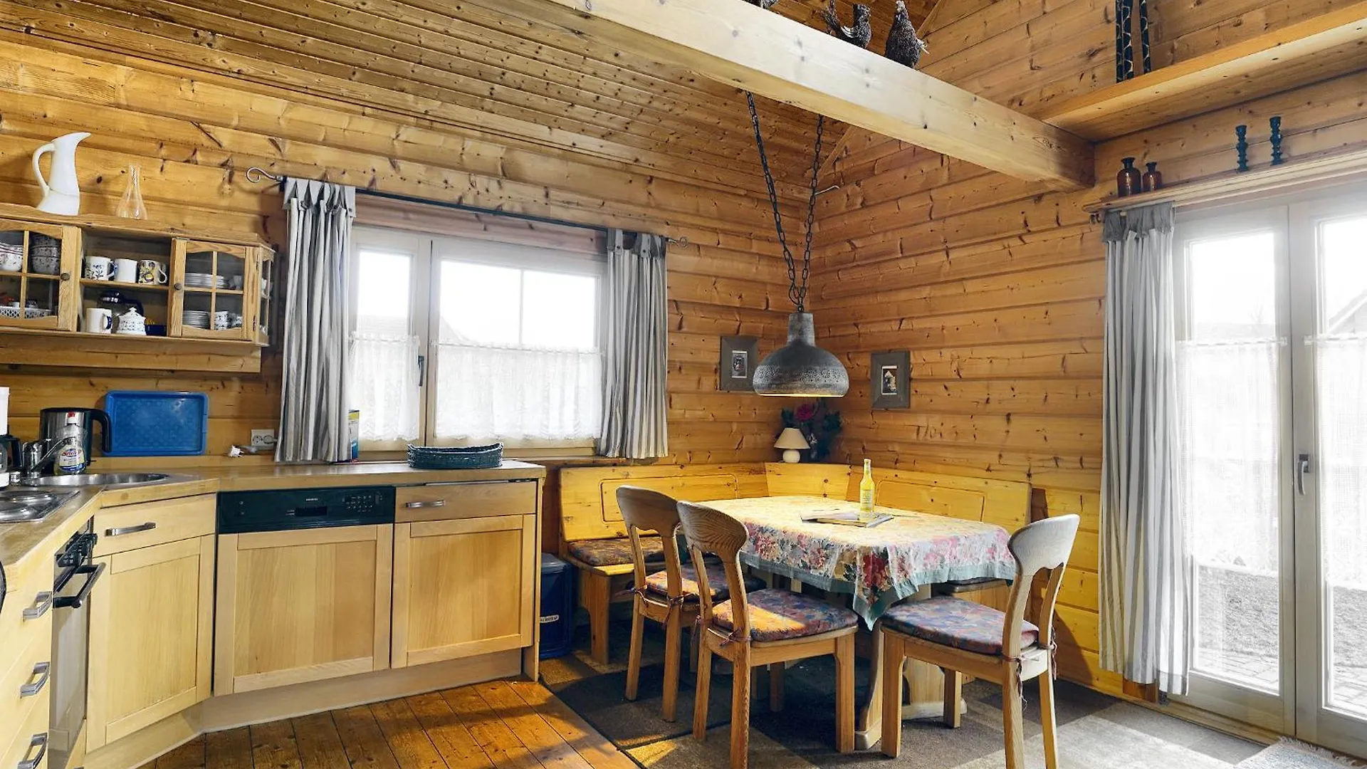 Zu der zusätzlichen Ausstattung gehört eine Küchenzeile, die auch einen Wasserkocher, einen Kühlschrank und einen Herd bietet.