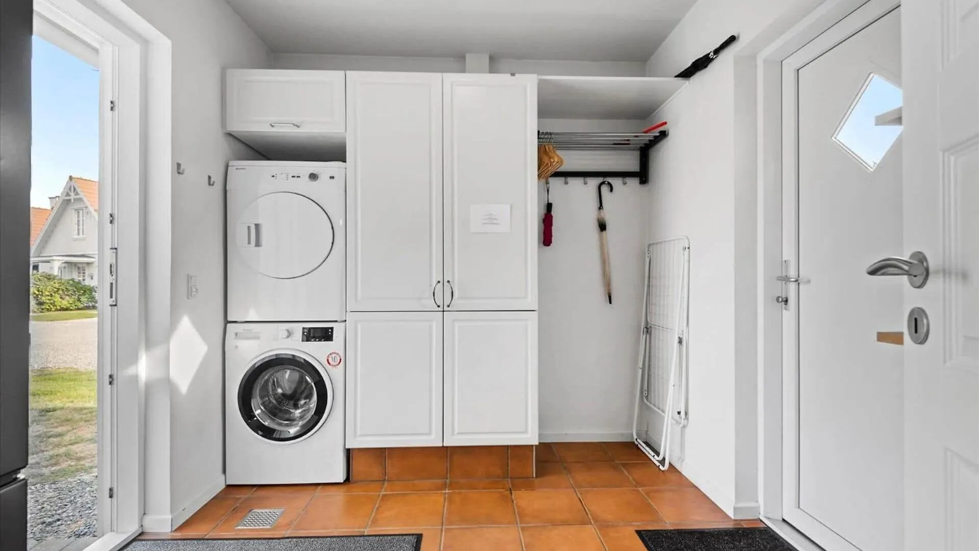 Die Villa in Blåvand verfügt über ein Badezimmer mit einer Dusche und einer Waschmaschine. Es werden auch ein Wäschetrockner angeboten.