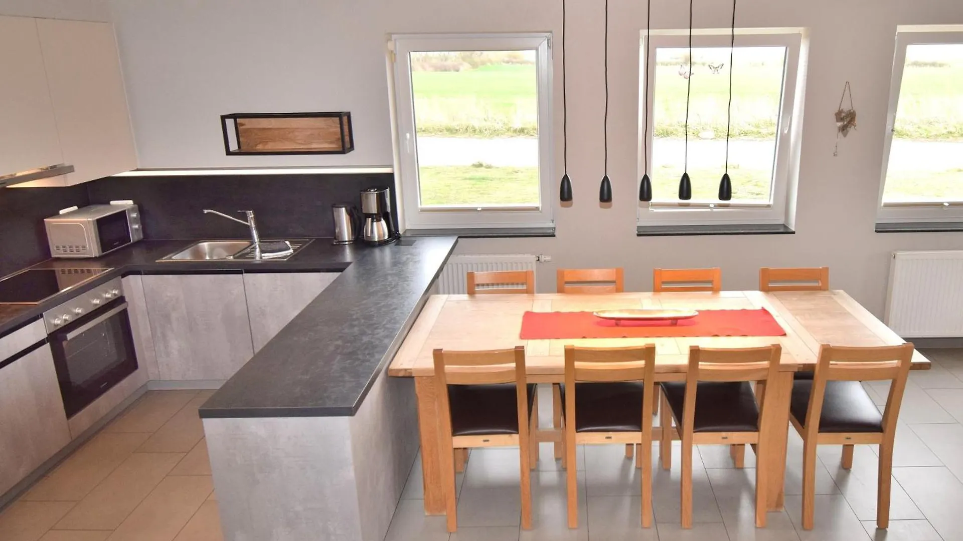 In der Villa Fehmarnstrand 78 RH 8 gibt es für Selbstversorger einen Wasserkocher, einen Kühlschrank und einen Herd, die in einer Küchenzeile zur Verfügung stehen.