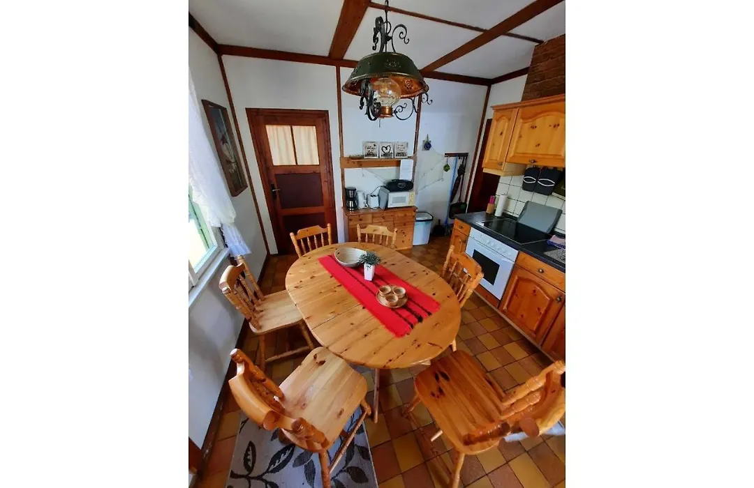 Die Villa Ferienbungalow Waldstrasse ist mit einer voll ausgestatteten Küchenzeile sowie einem Wasserkocher, einem Kühlschrank und einem Herd ausgestattet, um Ihren Komfort zu gewährleisten.