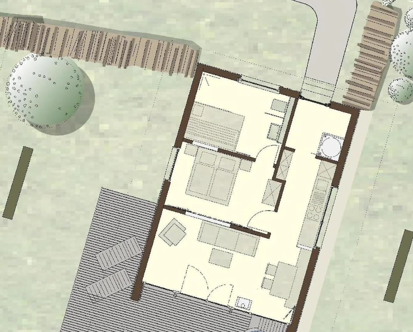 Ein Wasserkocher, ein Kühlschrank und ein Herd sind in der Küchenzeile vorhanden.