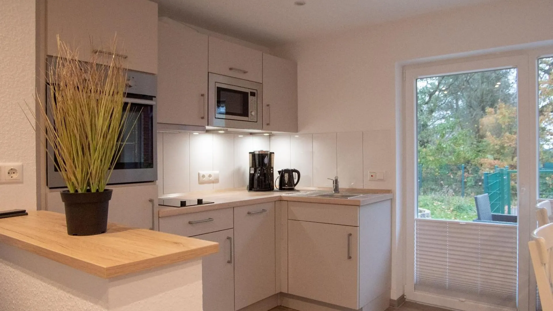 Neben den Annehmlichkeiten für Selbstversorger wie einer voll ausgestatteten Küchenzeile bietet die 1-Zimmer- Haus Seestern auch einen Essbereich im Freien. Die Küche verfügt außerdem über einen Wasserkocher, einen Kühlschrank und einen Herd.