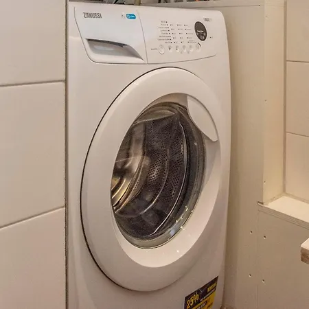 Zur Ausstattung des Badezimmers gehören auch eine getrennte Toilette, eine Dusche und eine Waschmaschine.