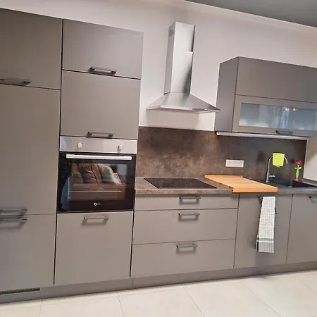 Für Selbstversorger gibt es in der Ferienhaus Lutki - Neues Familiendomiziel im Spreewald - Ideal für Hundehalter eine voll ausgestattete Küchenzeile mit einem Wasserkocher, einem Kühlschrank und einem Herd.