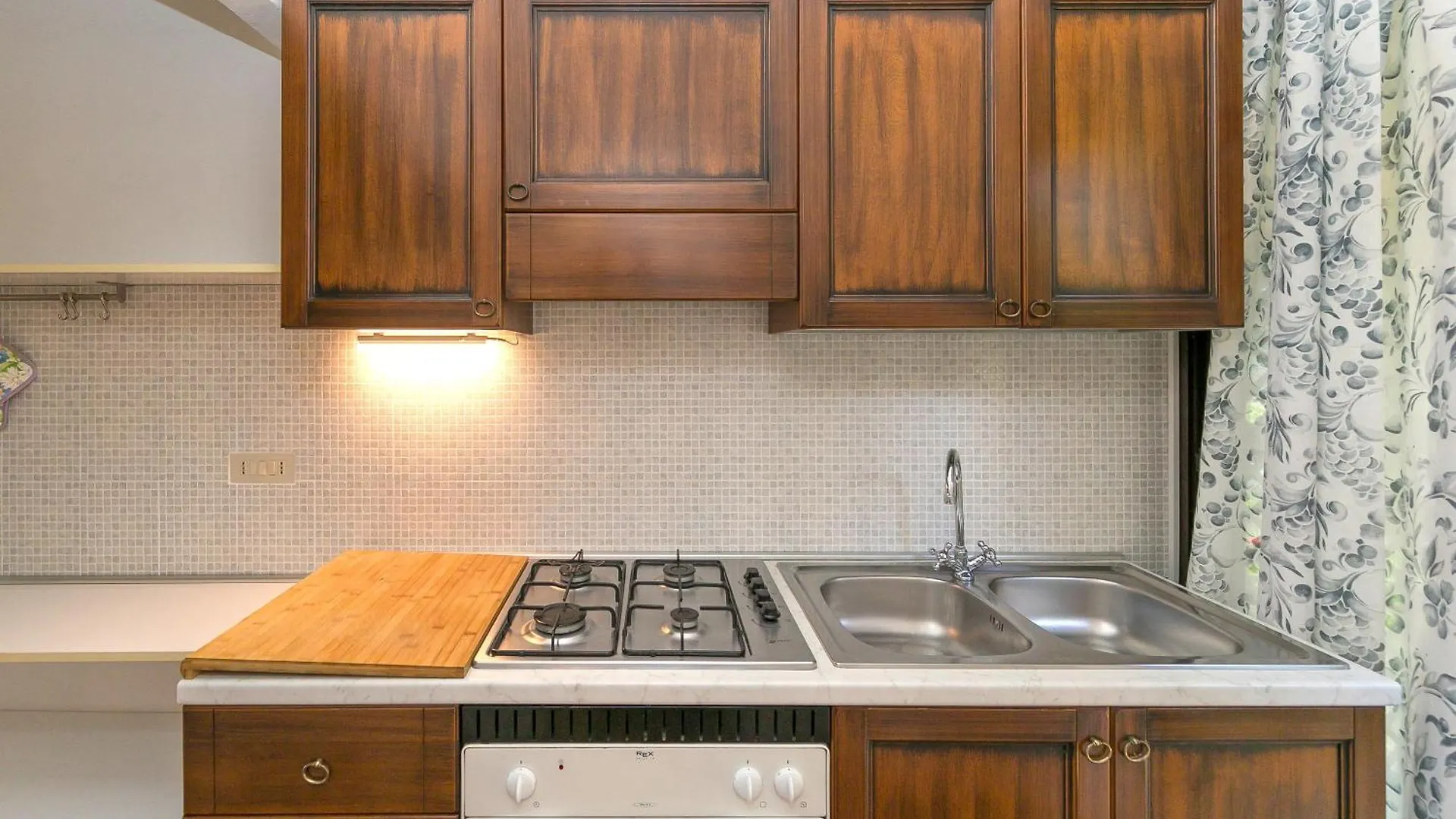 Ein Kühlschrank, ein Herd und Küchenutensilien in einer voll ausgestatteten Küche sorgen für einen angenehmen Aufenthalt.